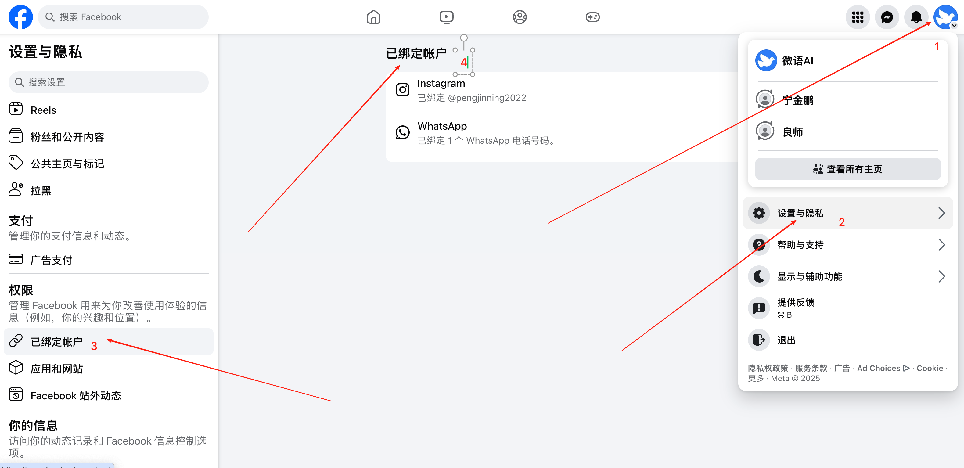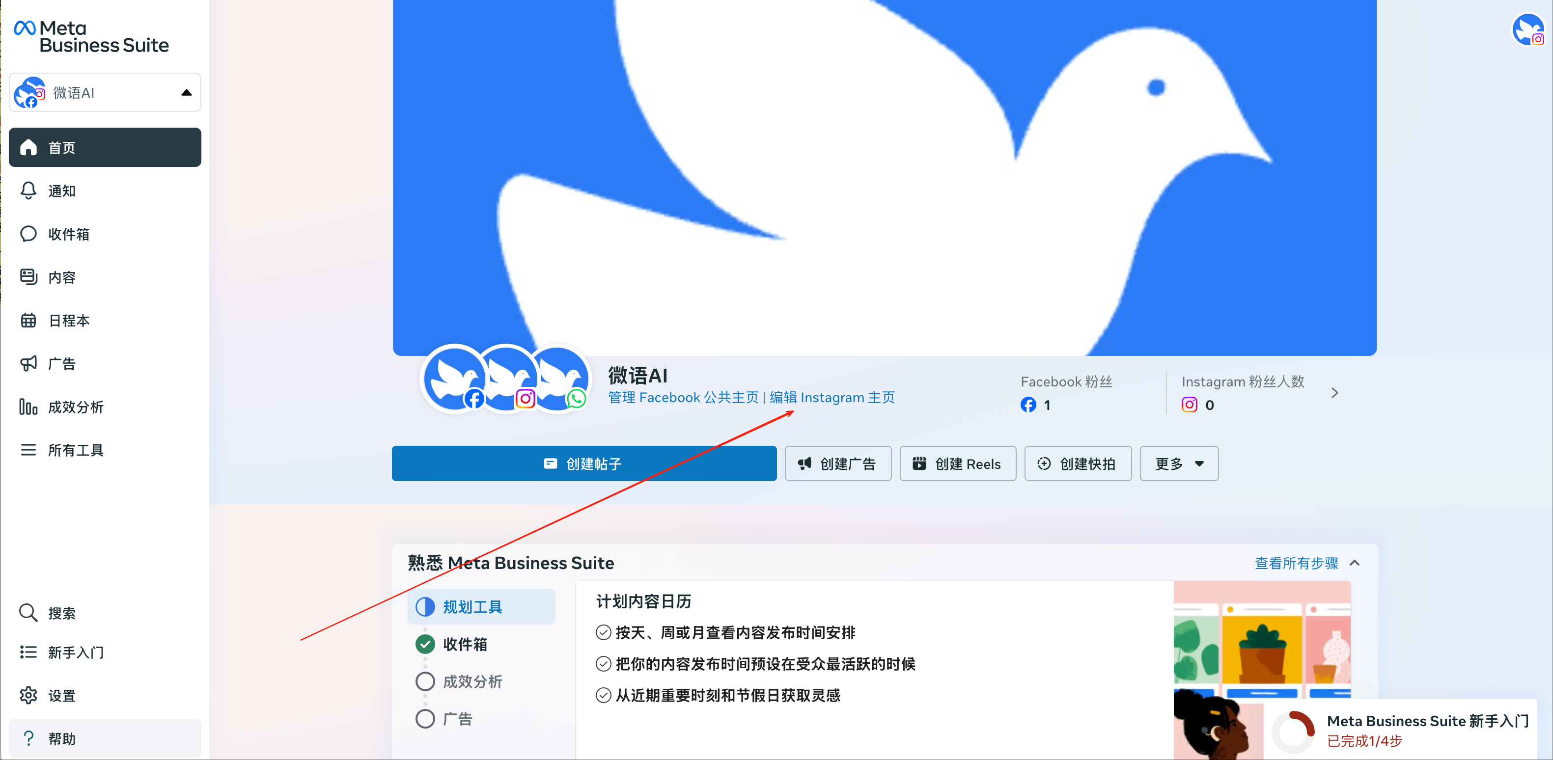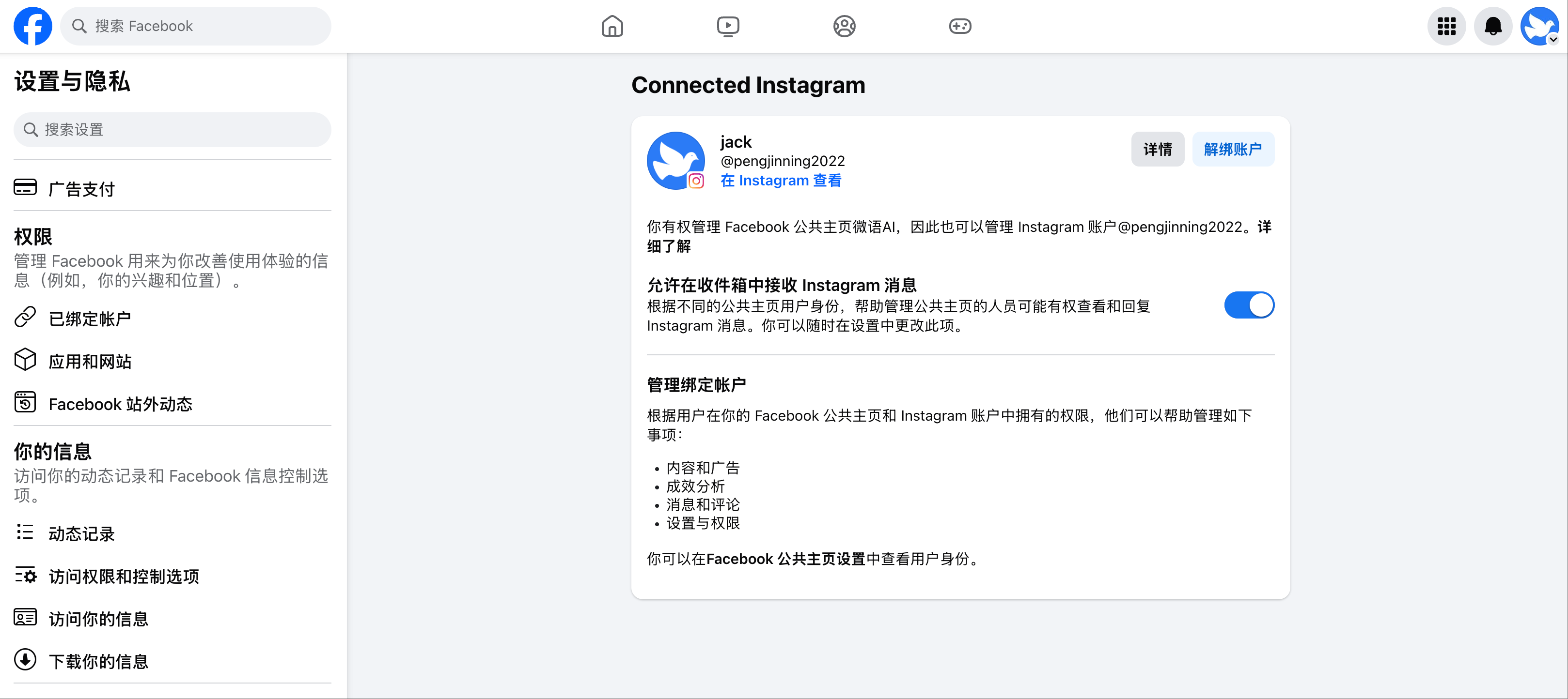 绑定 Facebook 公共主页和 Instagram 账户的步骤: